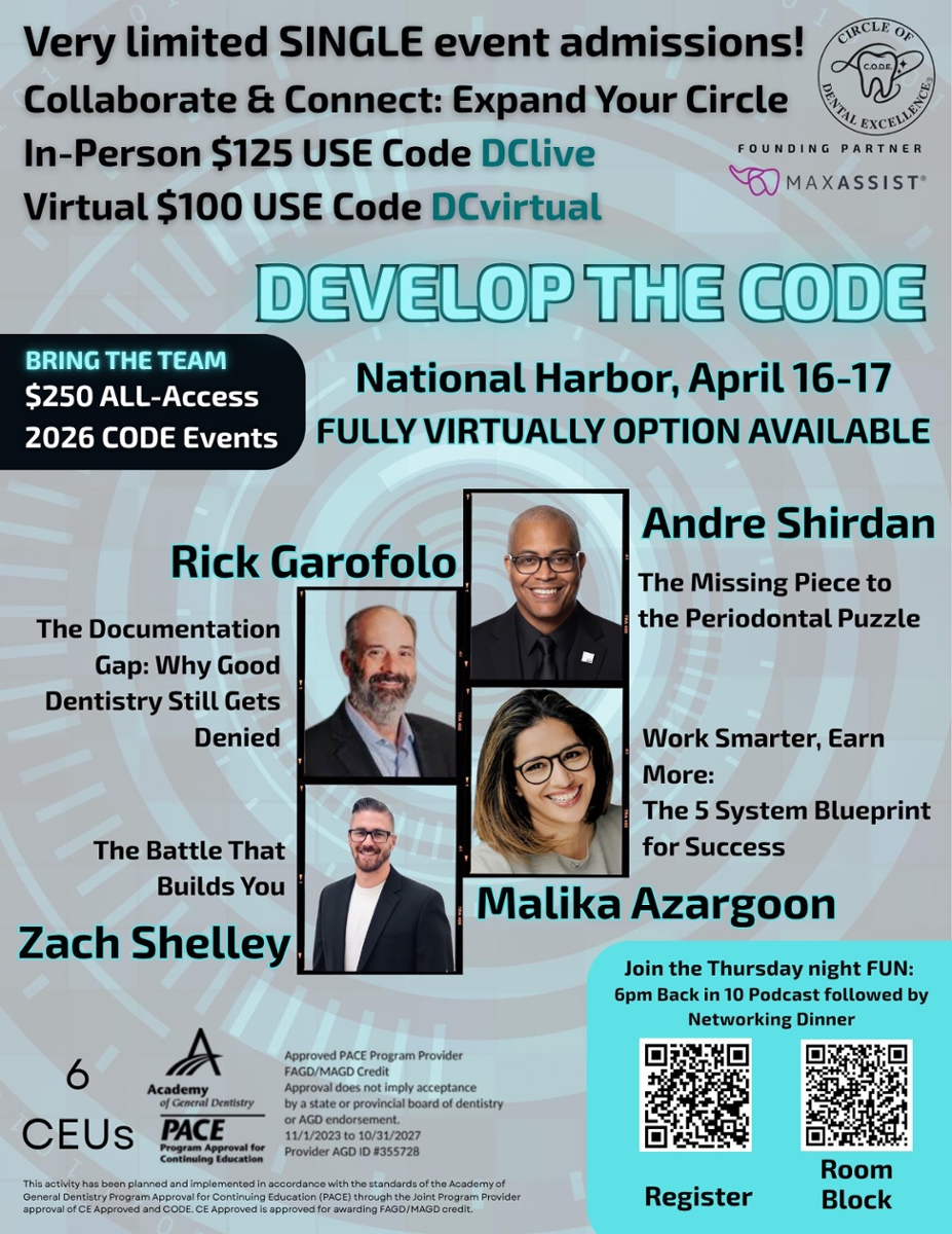 The Circle of Dental Excellence (CODE) was created to provide enhanced educational opportunities for ALL dental professionals. CODE will feature monthly virtual Masterminds, along with unique full-day events including in-person and virtual/hybrid access. Our goal is to provide high-quality education that helps the entire dental team thrive.