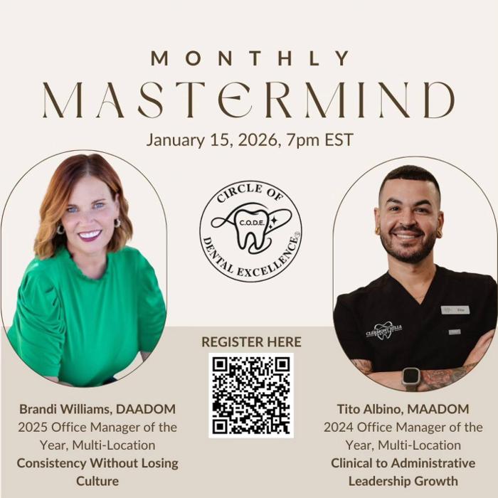 The Circle of Dental Excellence (CODE) was created to provide enhanced educational opportunities for ALL dental professionals. CODE will feature monthly virtual Masterminds, along with unique full-day events including in-person and virtual/hybrid access. Our goal is to provide high-quality education that helps the entire dental team thrive.